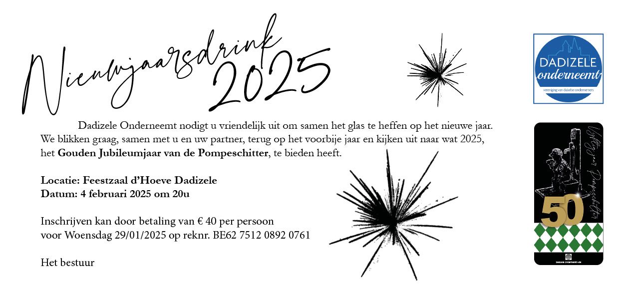 Het team van Dadizele Onderneemt zou het oprecht waarderen mochten u en uw partner op maandag 06 februari 2024 aanwezig zijn op onze Nieuwjaarsreceptie in Restaurant ZET U om samen het glas te heffen op het nieuwe jaar. Het is een ideaal netwerkmoment voor alle ondernemers van Dadizele.